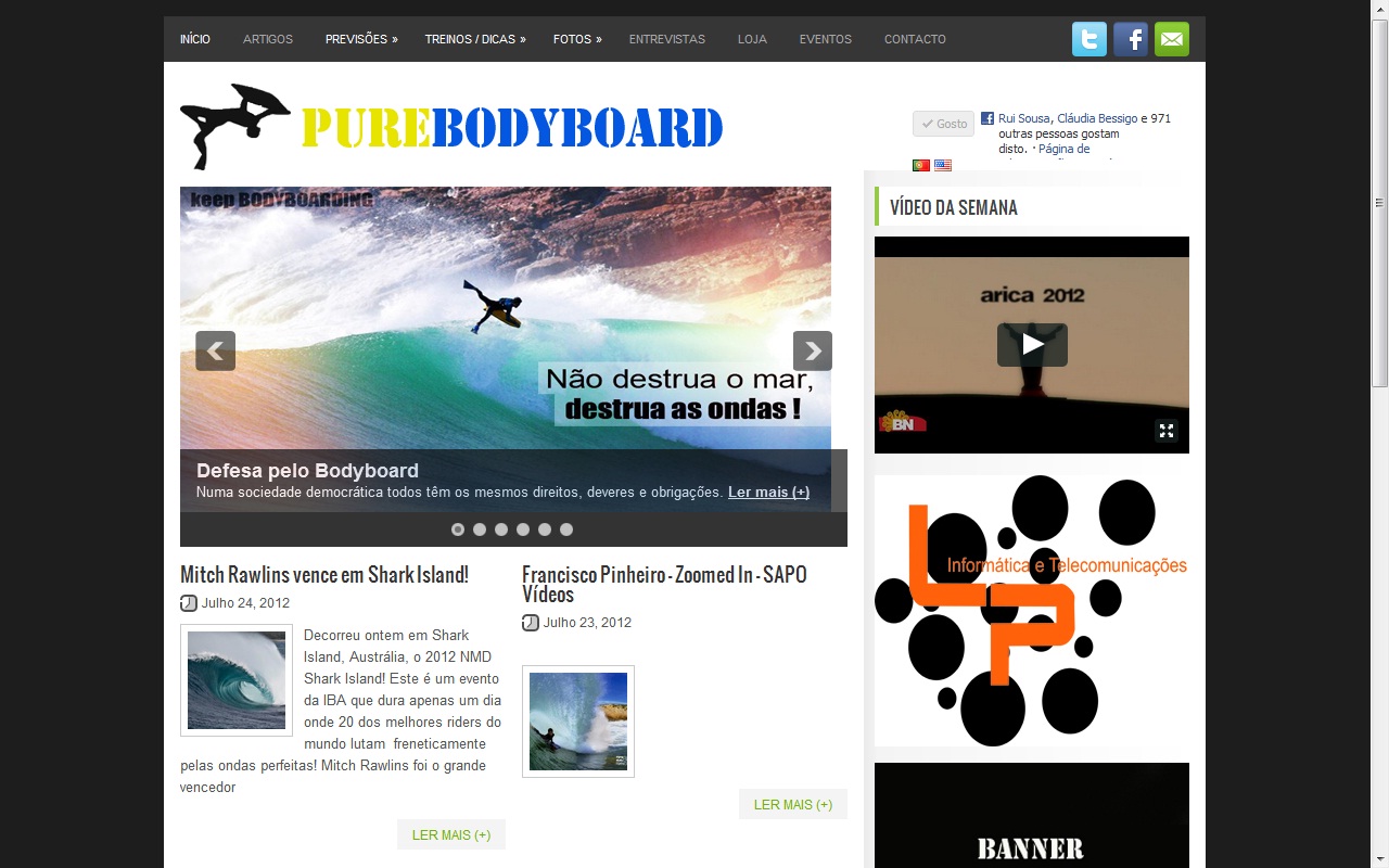 O Pure Bodyboard é um site que tem como objectivo promover e divulgar a actividade desportiva do Bodyboard. Nesta vertente, procuramos sempre dar ênfase a tudo o que é nacional, seja atletas, praias, shapers ou marcas. Tentamos também fornecer informação útil para admiradores, seguidores e praticantes não federados da modalidade, através de artigos de opinião, câmeras online das praias nacionais com previsões das condições para a prática do desporto, transmissão em directo de algumas das provas internacionais e nacionais de bodyboard e alguns videos com dicas e conselhos para os praticantes. Procuramos aliar um desporto de campeões a uma marca moderna e arrojada